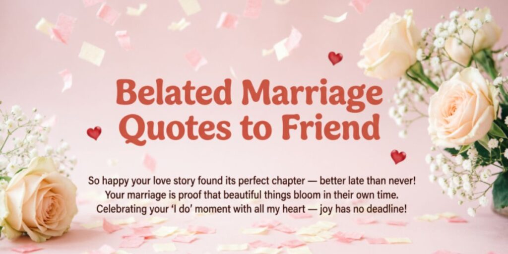 A friend’s wedding is always a joyful occasion, and sometimes we realize too late that we forgot to send wishes. However, true friendship understands small delays without any problem. Moreover, heartfelt Belated Marriage Quotes to a friend can still convey happiness and warm feelings for their new journey. Therefore, even if your message comes later, it can still make your friend feel appreciated. In addition, a thoughtful message shows that you genuinely care about their happiness. Finally, these Belated Marriage Quotes make your late wishes meaningful and heartfelt.